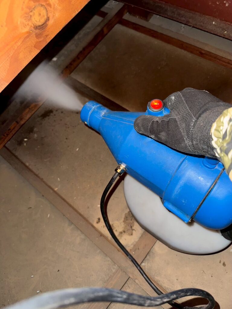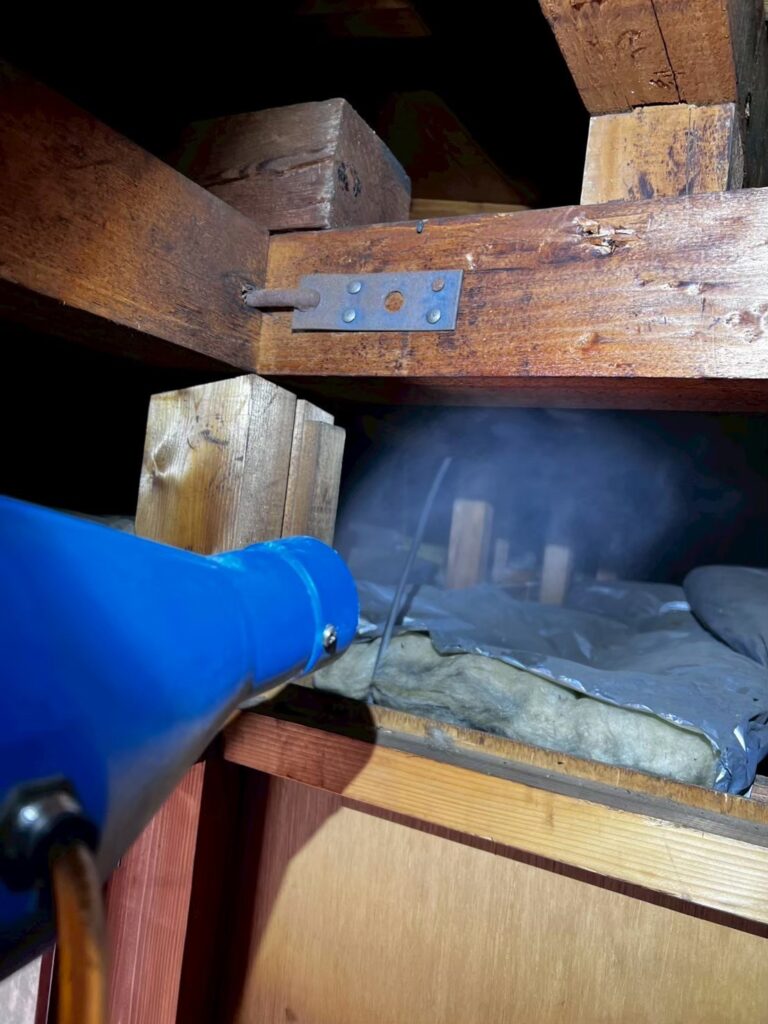 建物は木造二階建て、以前にも他業者による駆除が行われていたものの、その後も被害が収まらず、室内での目撃もある状況でした。
